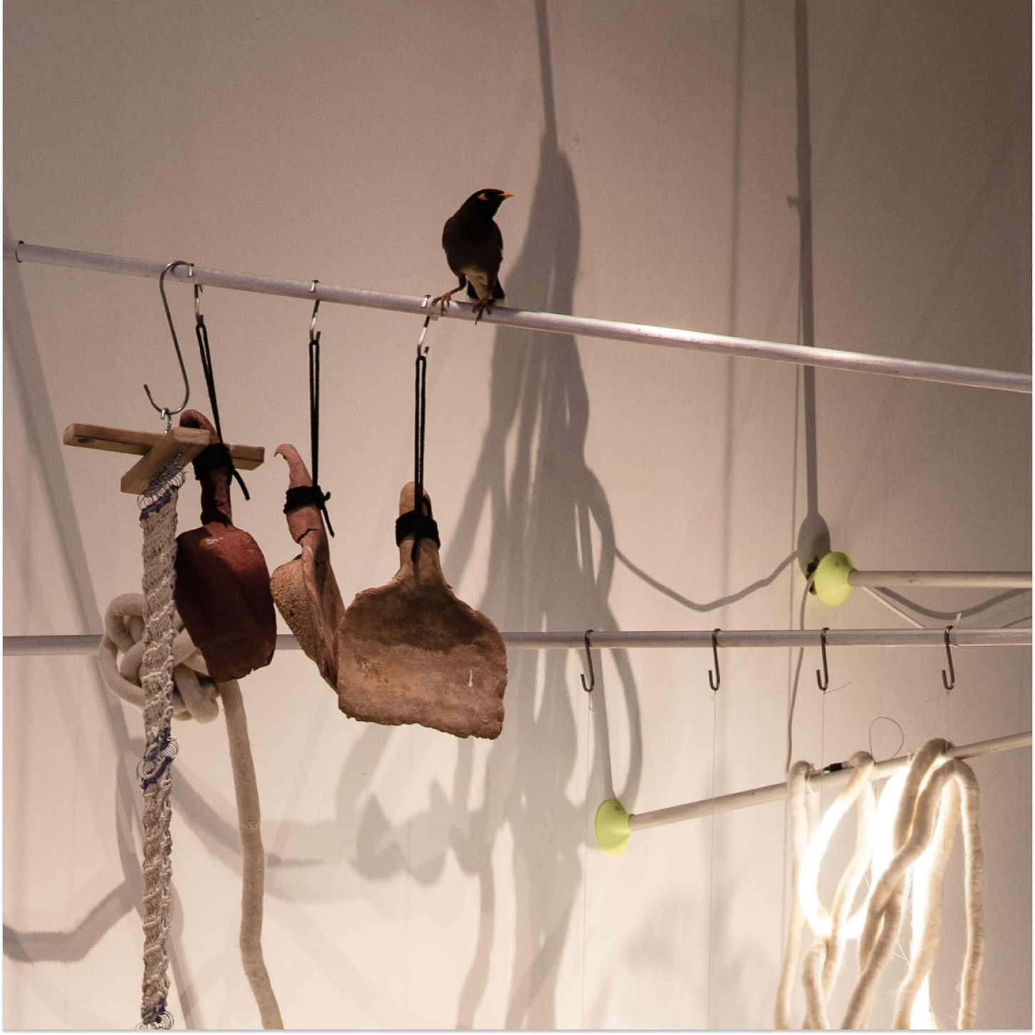 A series of fruit and trowel shaped objects, suspended like hams and sausages in a butcher shop, were created from accumulated studio dust as a response to Yuval’s manifesto, which calls for exploring acts of design without material — a-materiality.